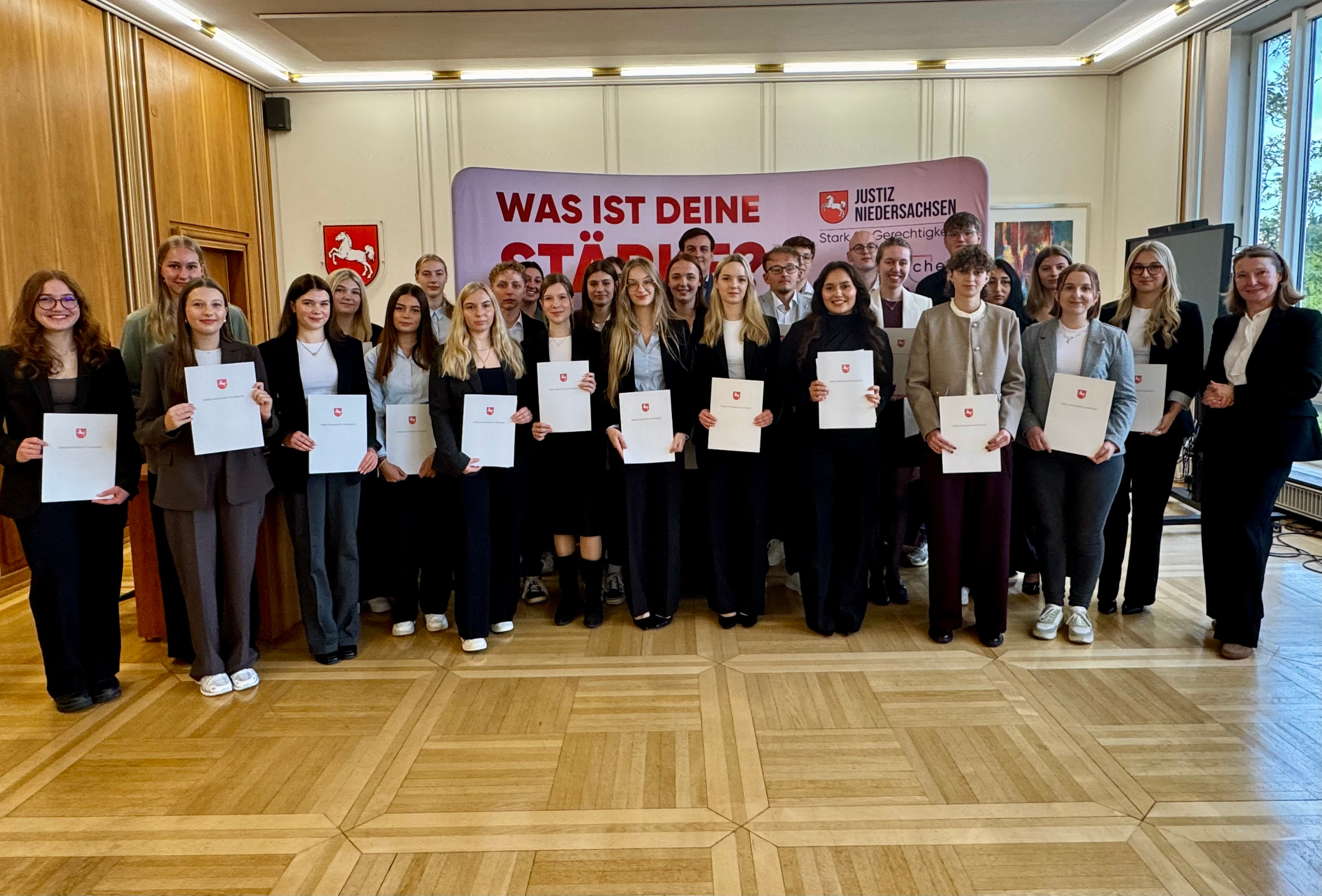 Grund zur Freude am Oberlandesgericht Oldenburg: Am heutigen Dienstag hat die Präsidentin des Oberlandesgerichts Oldenburg, Anke van Hove, 28 Studienanfängerinnen und Studienanfängern die Ernennungsurkunden für den am 1. Oktober 2025 beginnenden Vorbereitungsdienst zum/zur Diplom-Rechtspfleger/-in ausgehändigt. Die neuen Anwärterinnen und Anwärter – von denen einige bereits im ehemals mittleren Dienst der Justiz bzw. als Justizangestellte tätig waren – konnten sich gegen zahlreiche Mitbewerberinnen und Mitbewerber durchsetzen.