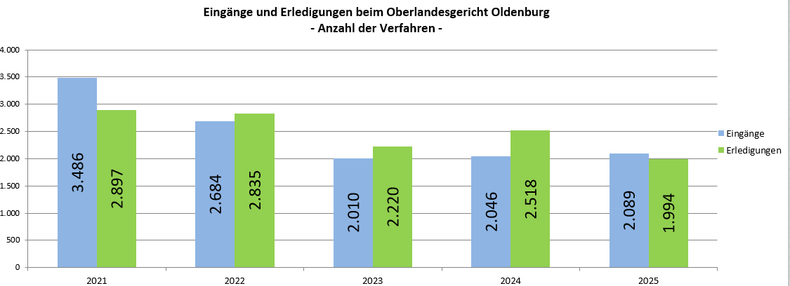 Höhere Eingänge in den Zivil- und Familiensachen und etwa gleichbleibende Zahlen bei den Strafsachen – dies ergibt die Auswertung der Zahlen zum Geschäftsanfall 2025 am Oberlandesgericht Oldenburg sowie im gesamten OLG-Bezirk, zu dem neben den drei Landgerichten Aurich, Oldenburg und Osnabrück 23 Amtsgerichte gehören.