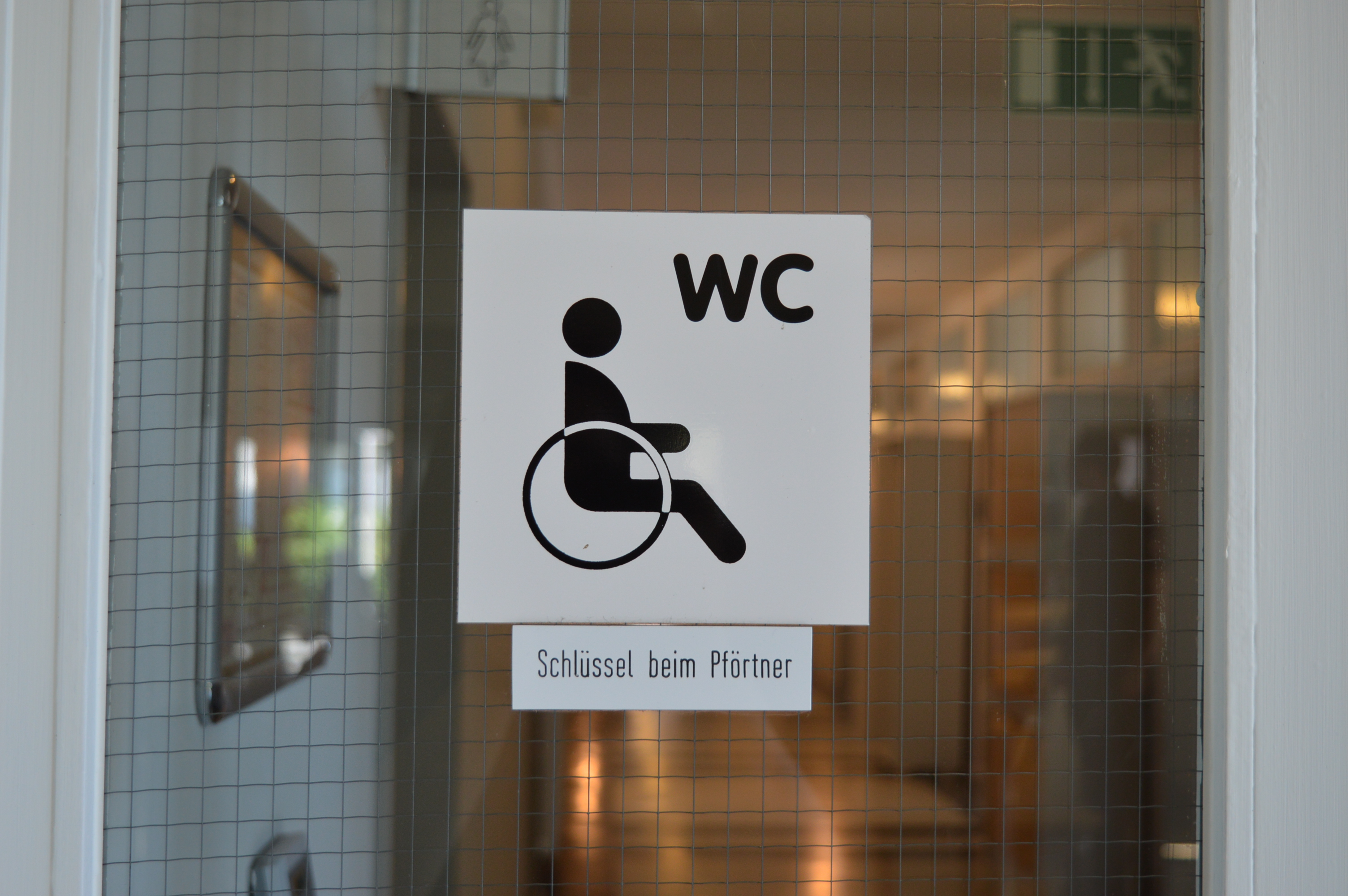 Die Behindertentoilette befindet sich am Flurende des Erdgeschosses. Den Schlüssel erhalten Sie am Servicepoint direkt am Eingang